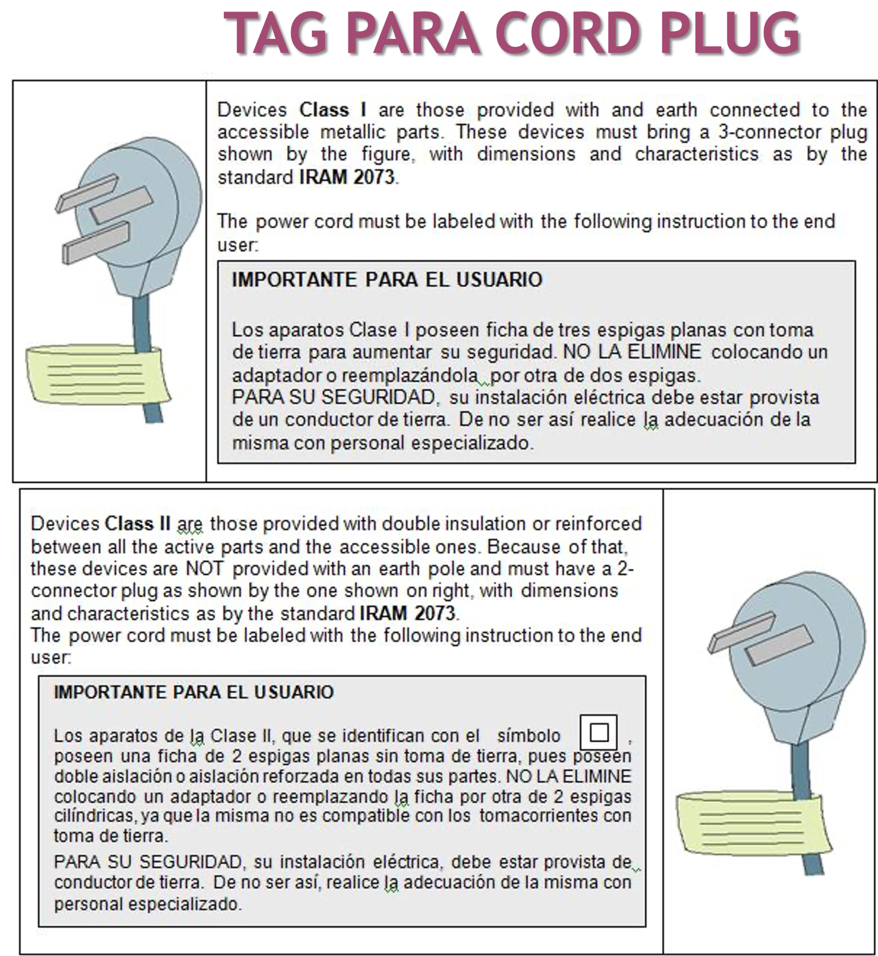 BEFORE: CORD plugs is mandatory with a labeling according to IRAM plugs 2073/2071 showing the following text: